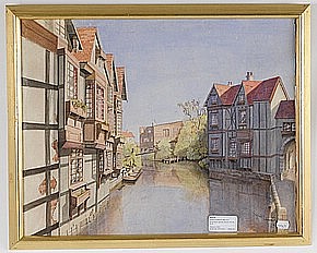När jag upptäckte att Norrköpings auktionsverk sålde en akvarell av Sigurd Lewerentz så tittade jag till lite extra. Motivet var en kanal med husfasader på båda sidor. Exakt ritat, nästan som med linjal, skalenligt. Jag tänkte att det var i Holland men samtidigt hade bilden ett ljus som verkade onaturligt och jag associerade vagt till en science fictionberättelse.